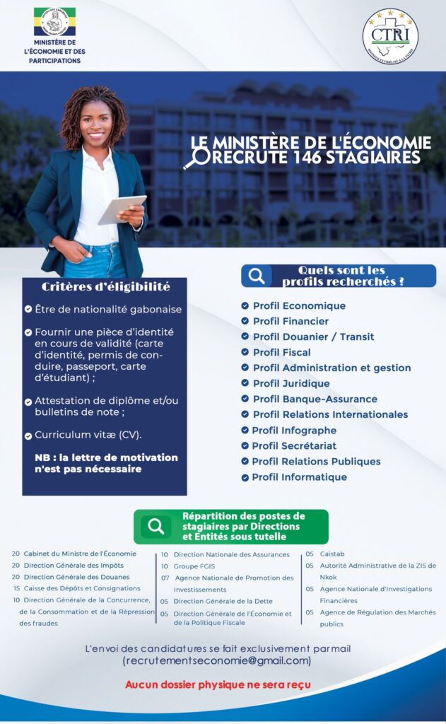 Afin de favoriser l’employabilitรฉ des jeunes prรดnรฉe par le Prรฉsident de la Rรฉpublique, le ๐๐ฬ๐ง๐ฬ๐ซ๐๐ฅ ๐๐ซ๐ข๐๐ ๐๐ฅ๐จ๐ญ๐๐ข๐ซ๐ ๐๐๐๐๐๐ ๐๐๐๐๐๐, le Ministรจre de l’Economie et des Participations recrute 146 stagiaires au sein du Cabinet du Ministre, des Directions Gรฉnรฉrales (Douanes, Dette, Impรดts, etc.) et des entitรฉs sous tutelle (FGIS, CDC, Caistab, etc.).