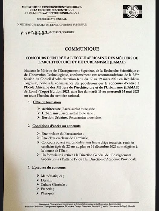 Pour toutes informations supplémentaires se rendre à la Direction Générale de l’Enseignement