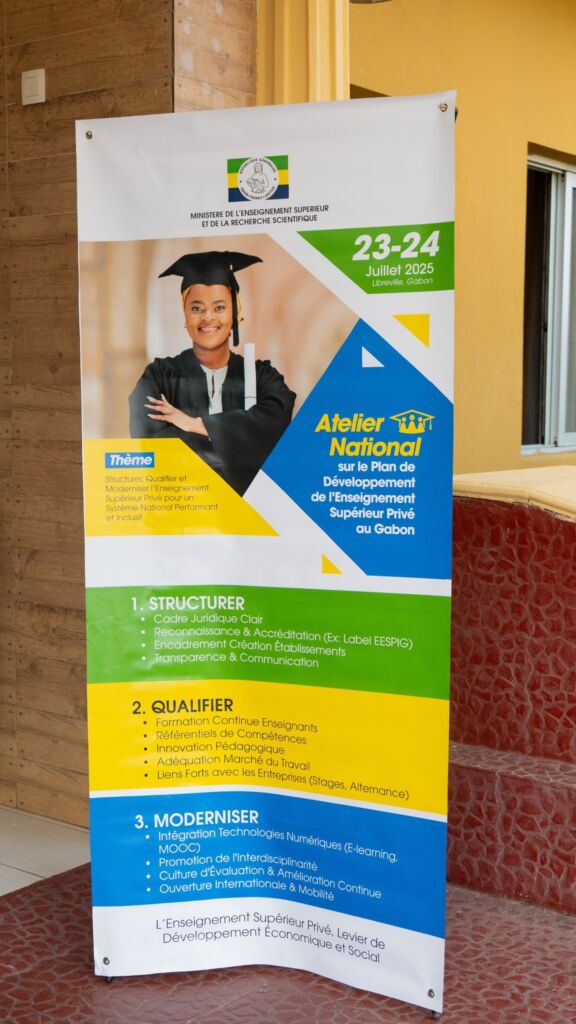 Du 23 au 24 juillet 2025, a eu lieu l’Atelier National sur le Plan de Dรฉveloppement de l’Enseignement Supรฉrieur Privรฉ, organisรฉ par le Ministรจre de l’Enseignement Supรฉrieur et de la Recherche Scientifique, ร l’hรดtel King’s Choise, sis au quartier Angondjรฉ, au Nord de Libreville.