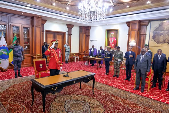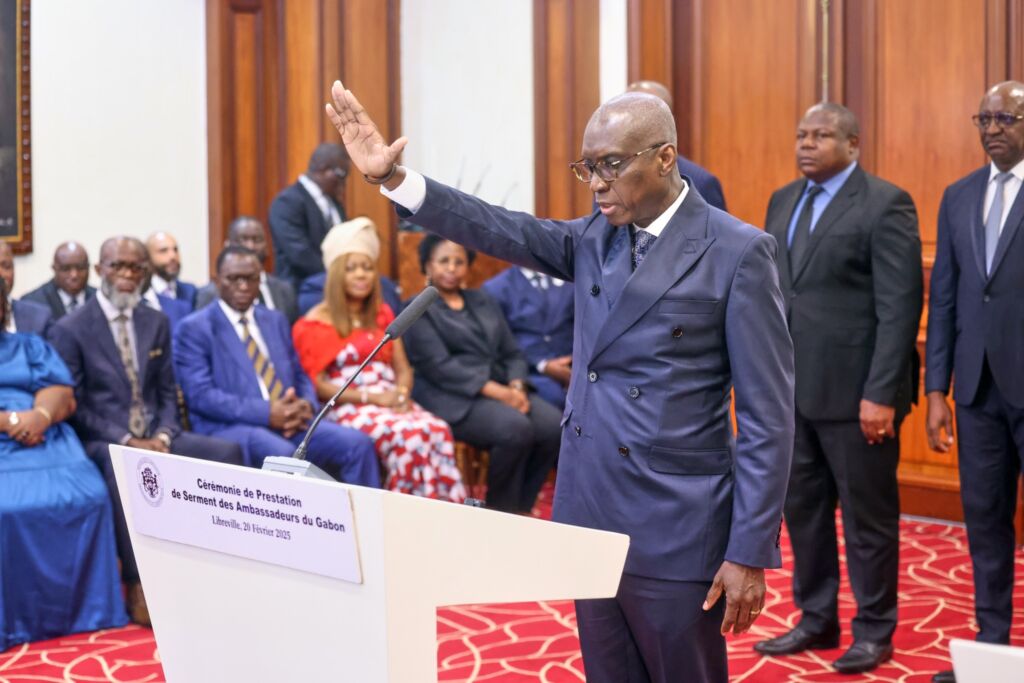 Ce 20 février 2025, le Chef de l’État, S. E. Brice Clotaire Oligui Nguema, a présidé la cérémonie de prestation de serment des nouveaux ambassadeurs du Gabon accrédités auprès des Républiques du Rwanda, de Cuba, de l’Inde, du Congo, de Sao Tomé-et-Principe, de l’Angola, ainsi qu’auprès de l’Office des Nations Unies à Genève.