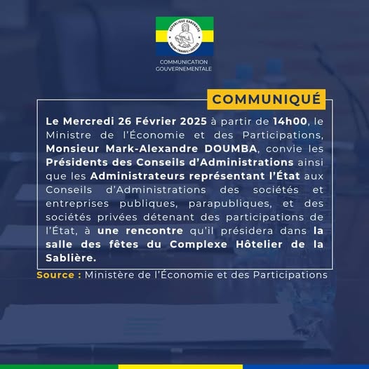 Le mercredi 26 Février 2025, le Ministre de l’Économie et des Participations réunira les présidents des conseils d’administration ainsi que quelques partenaires sous tutelle dans une structure de la place pour une importante réunion.