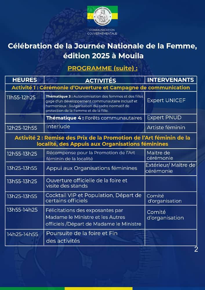 À Mouila, la Journée nationale de la femme sera marquée par plusieurs temps forts entre autres, la remise du Prix de la promotion de l’art féminin local, récompensant les talents féminins de la région. Une journée festive et engagée, dédiée à l’honneur et à la créativité des femmes de Mouila.