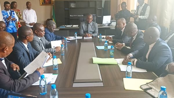 Le 16 mai 2025, le Ministre d’État Ulrich Manfoumbi-Manfoumbi a rencontré les responsables syndicaux de son ministère à l’immeuble Arambo.