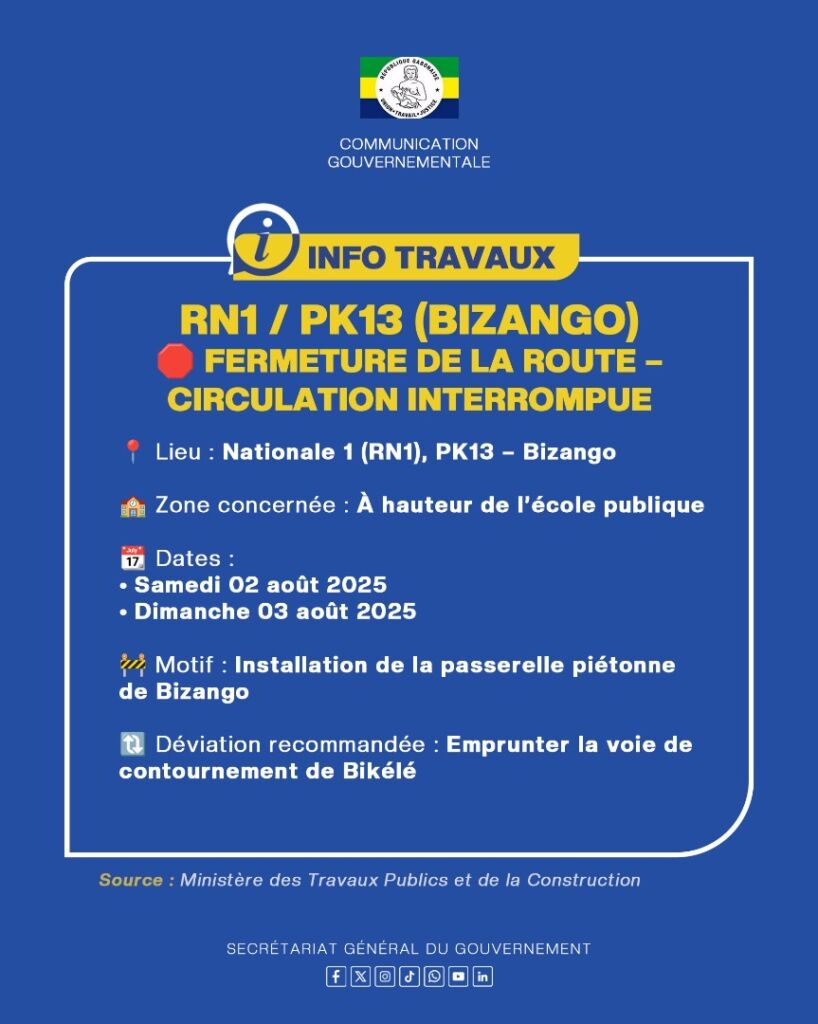 FERMETURE TEMPORAIRE DE LA RN1 / PK13 (BIZANGO)